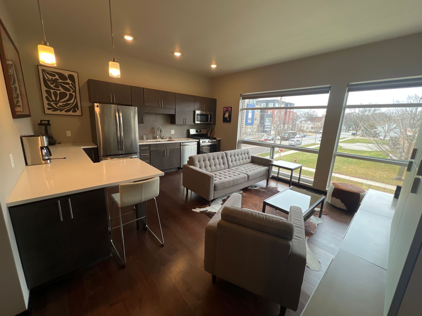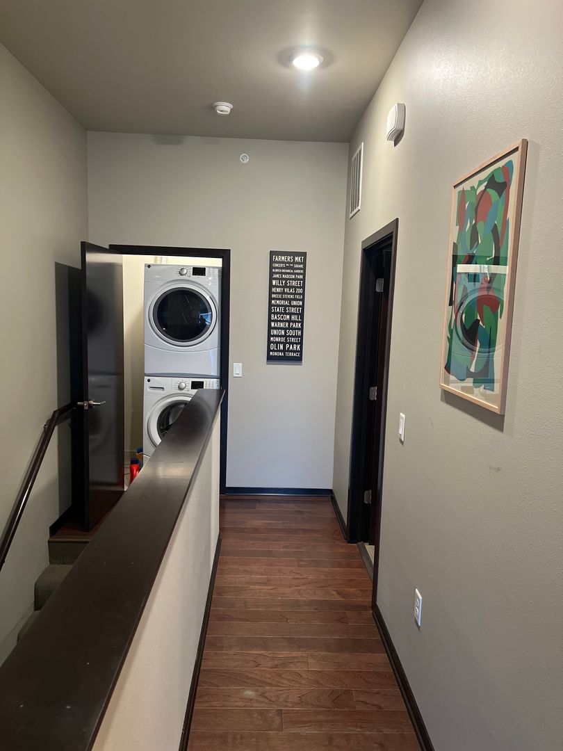 Looking to live downtown in a fully furnished townhome with an excellent floorplan? Check out this fully furnished space with a sleek modern design. It features 11ft ceilings, large windows, garage door window, huge family room with wood floors, heated flooring in the lower level. a kitchen with quartz countertops, stainless steel appliances and a breakfast bar! Laundry units in townhome.